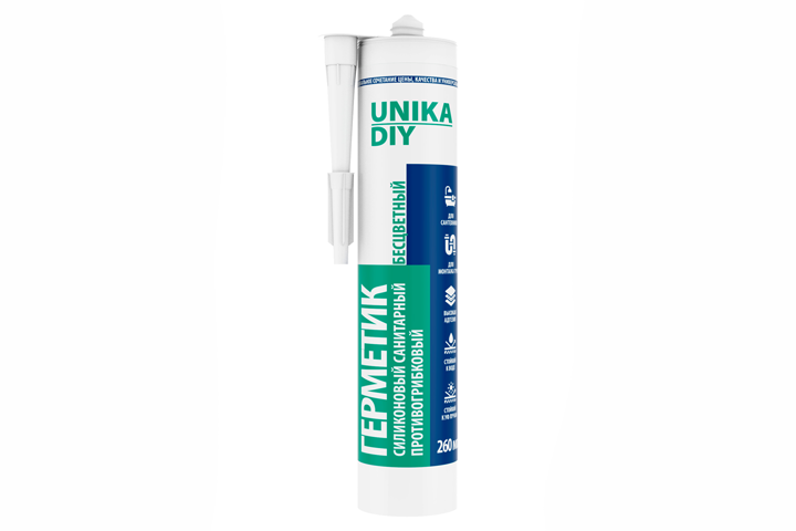 Силиконовый санитарный герметик UNIKA DIY, прозрачный (260 мл, упаковка 1/24) — это универсальный уплотнительный материал, предназначенный для герметизации швов и стыков в помещениях с повышенной влажностью. Прозрачная формула обеспечивает аккуратный и незаметный шов, идеально подходящий для ванной, кухни, сантехнических изделий и оконных рам. Герметик обладает хорошей адгезией к большинству строительных материалов: керамике, стеклу, металлу, пластику и древесине. После затвердевания он остаётся эластичным, устойчивым к воздействию воды, плесени и грибка, обеспечивая долговечную защиту и герметичность швов.