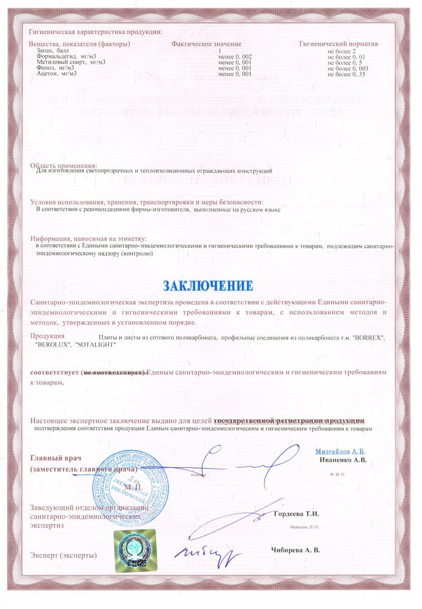 Санитарно-эпидемиологическое заключение (обратная сторона)