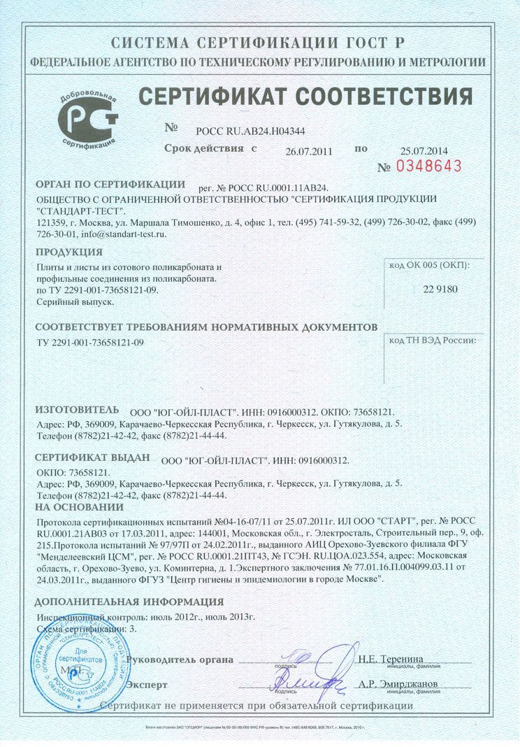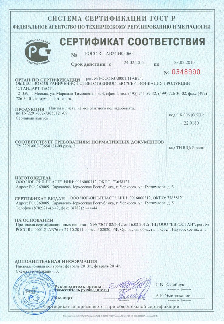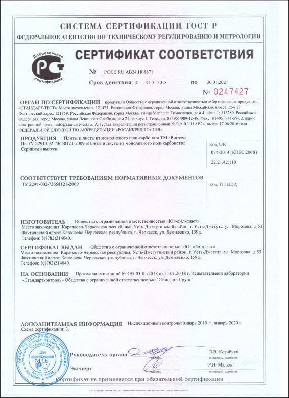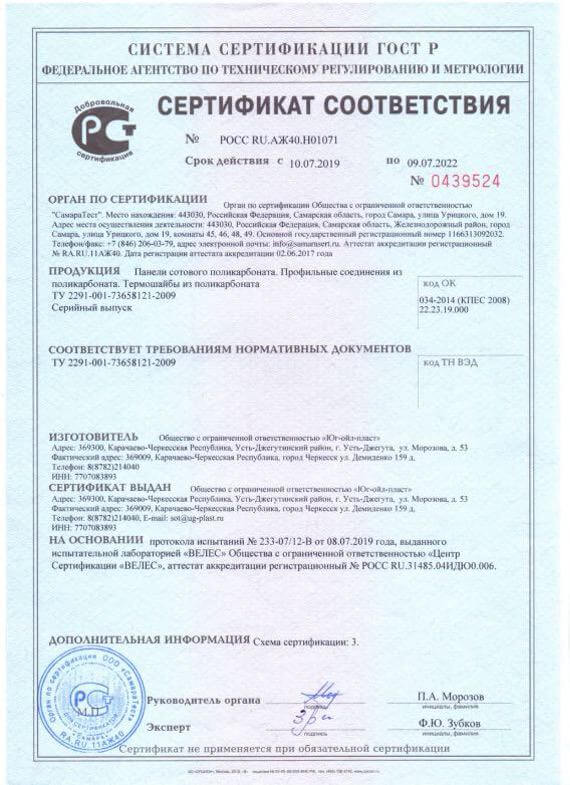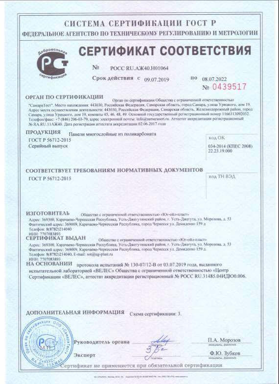 Сертификат соответствия ГОСТ Р 56712 Панели многослойные из поликарбоната