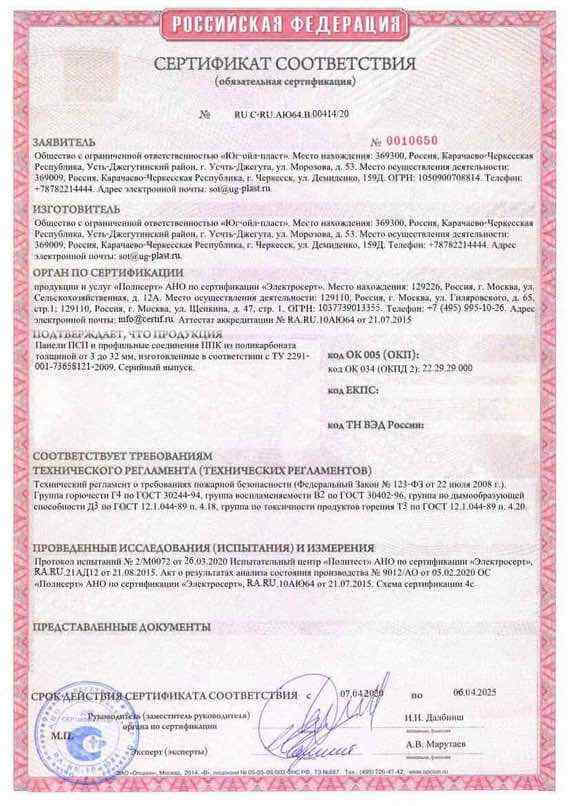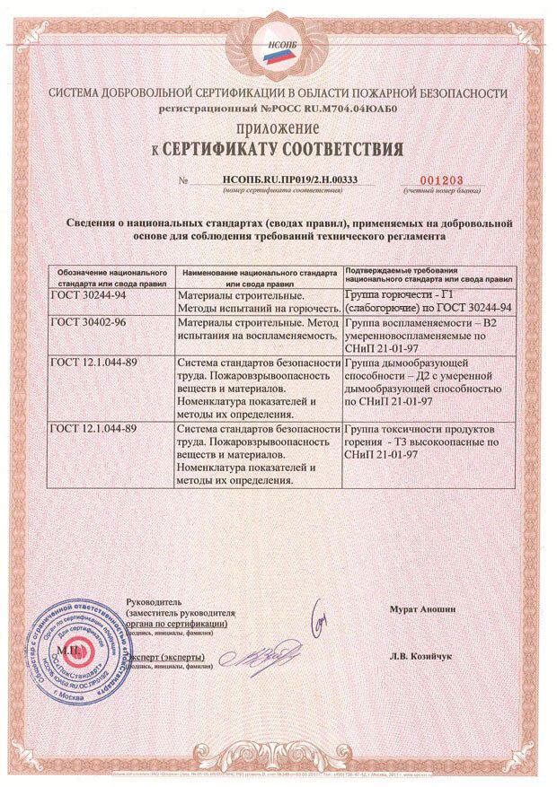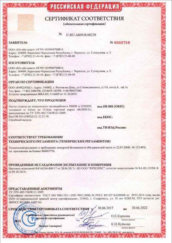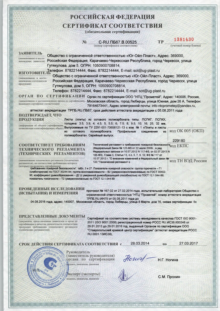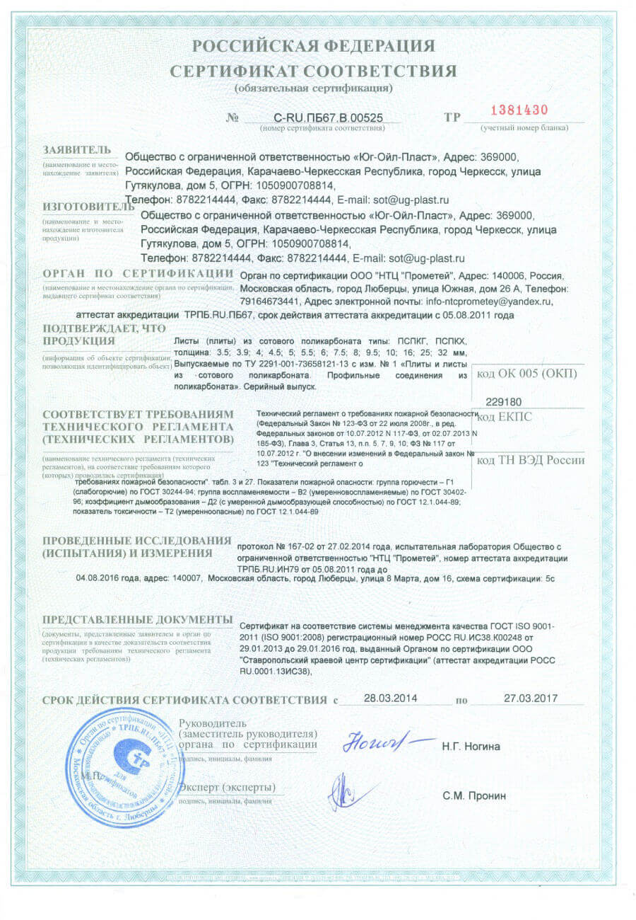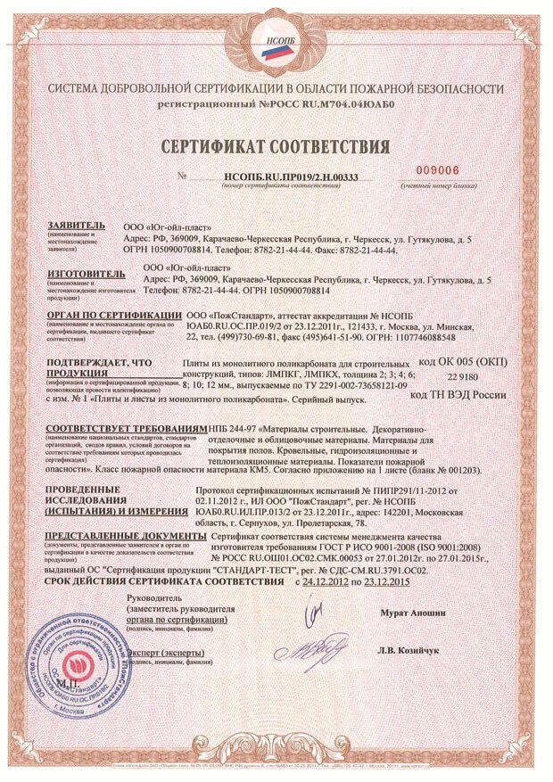 Сертификат пожарной безопасности сотовый поликарбонат и профильные соединения