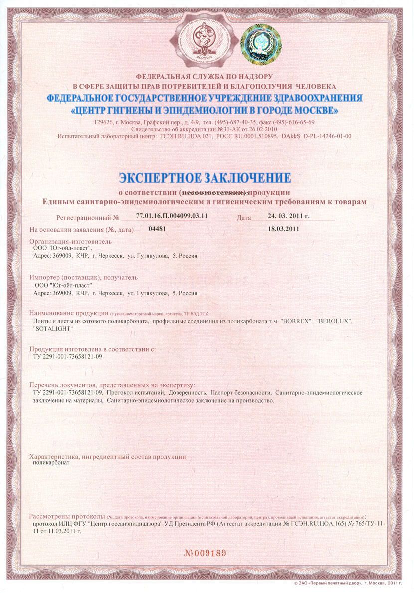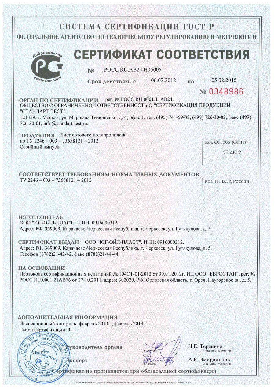 Сертификат на сотовый полипропилен