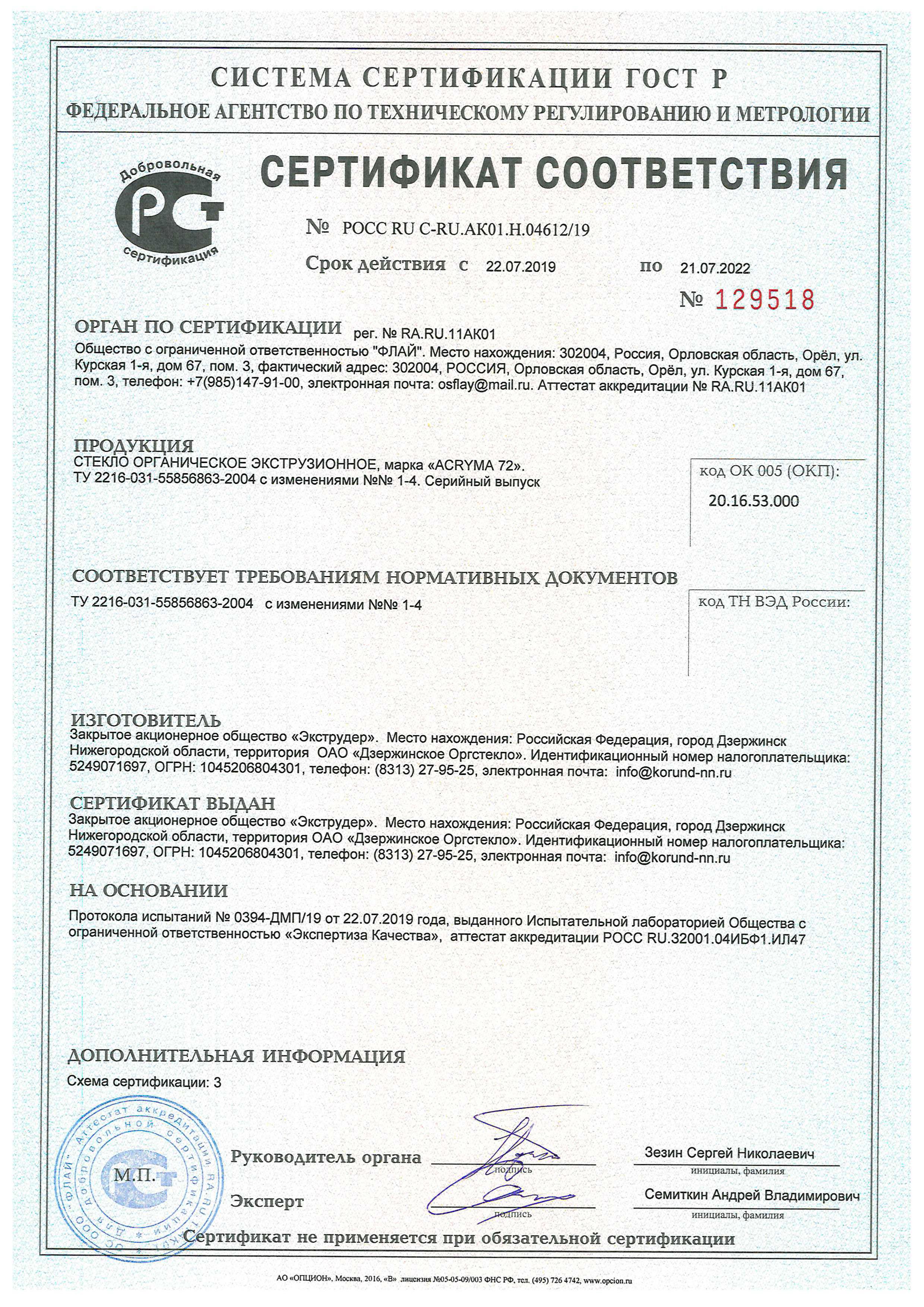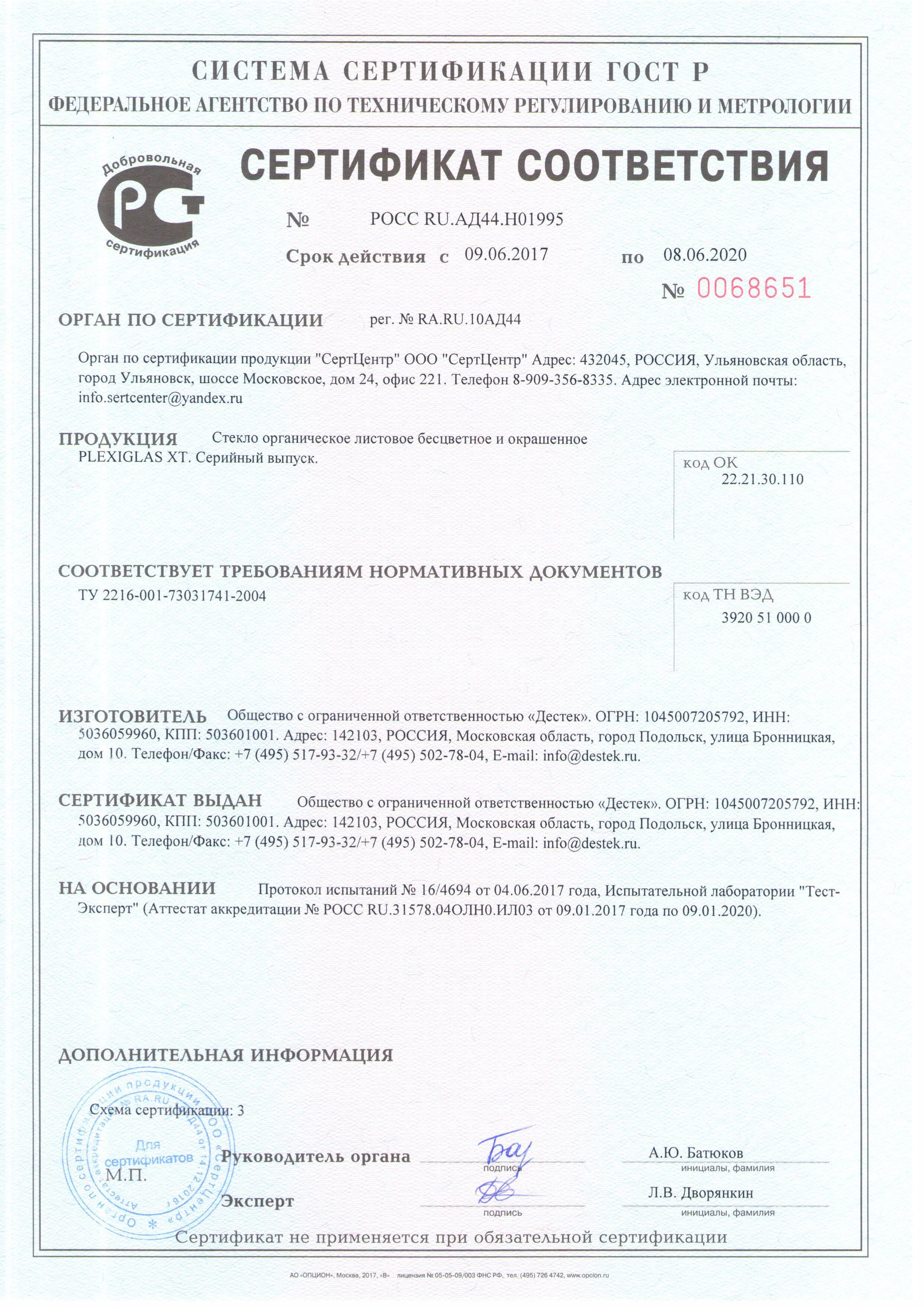 Сертификат соответствия PLEXIGLAS