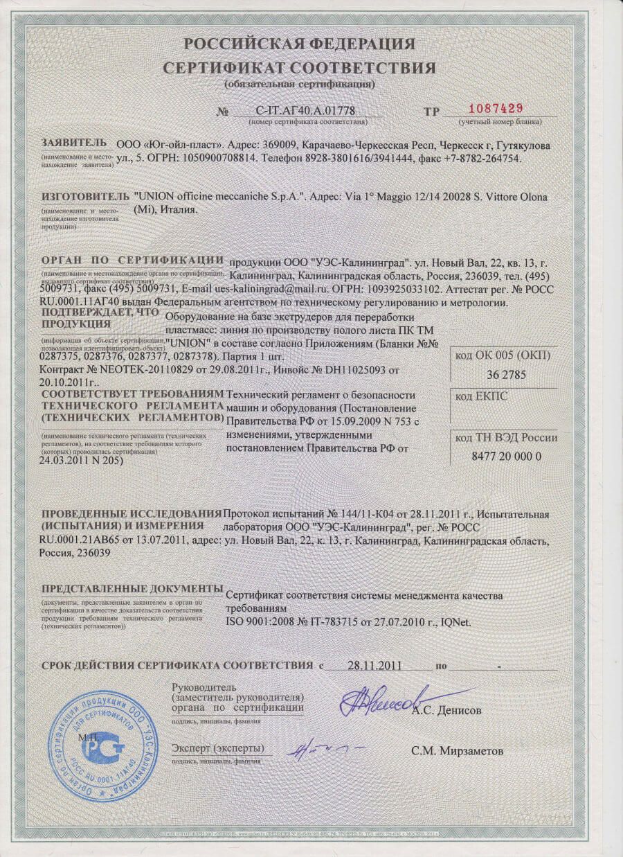 Сертификат соответствия итальянской линии «UNION» требованиям технического регламента